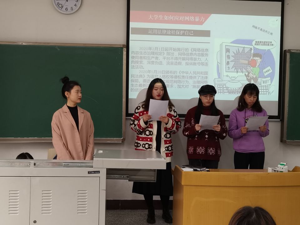 第二,形式多样,富有创新。同学们在进行课堂展示时,不断创新展示形式。有的小组采用“新闻主播”+“专家会谈”的形式;有的小组采用“主场”+“外场”联动方式;有的小组采用“现场表演”的方式;有的小组采用“讨论”、“辩论”等形式。总之,同学们花费了一定精力,创新了展示形式。