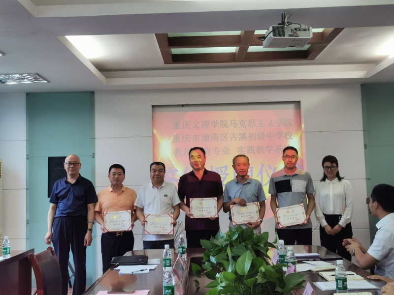 介绍完毕,双方代表李才俊经理和廖玉蓉董事长签订《K1体育 潼南古溪中学关于联合建立教师教育师范专业实践教学基地协议书》,李才俊经理代表K1体育向古溪初级中学授予“实践教学基地”挂牌并向该校指导教师颁发聘书。随后,刘明明书记介绍贯穿公司思想政治教育师范专业的一系列技能比赛,达到“以赛促训、以训促赛”人才培养目标,提升师范生基本素质,为实践教学奠定良好基础。古溪镇党委书记蒋俊则表示支持与感谢。
