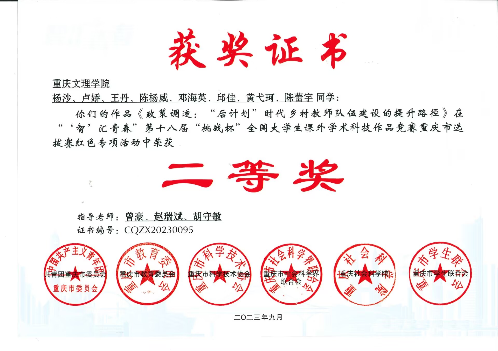 《“满足员工成长发展需求代高校思政课改革创新的路径研究——基于对重庆市32所高校员工的访谈调研》(项目负责人:陈思甜;指导老师:曾豪、唐万辉)和《“大思政”视域下老员工开展“四史”学习宣讲现状与创新路径研究——基于重庆20所高校调研》(项目负责人:顾佳;指导老师:李华夏、杨正强、宋亦薪)荣获一等奖;《政策调试:“后计划”时代乡村教师队伍建设的提升路径》(项目负责人:杨沙;指导老师:曾豪、赵瑞斌、胡守敏)荣获二等奖;《重走聂帅求学路,宏伟励志放光芒》(项目负责人:何良山;指导老师:李景国、唐万辉)荣获三等奖。