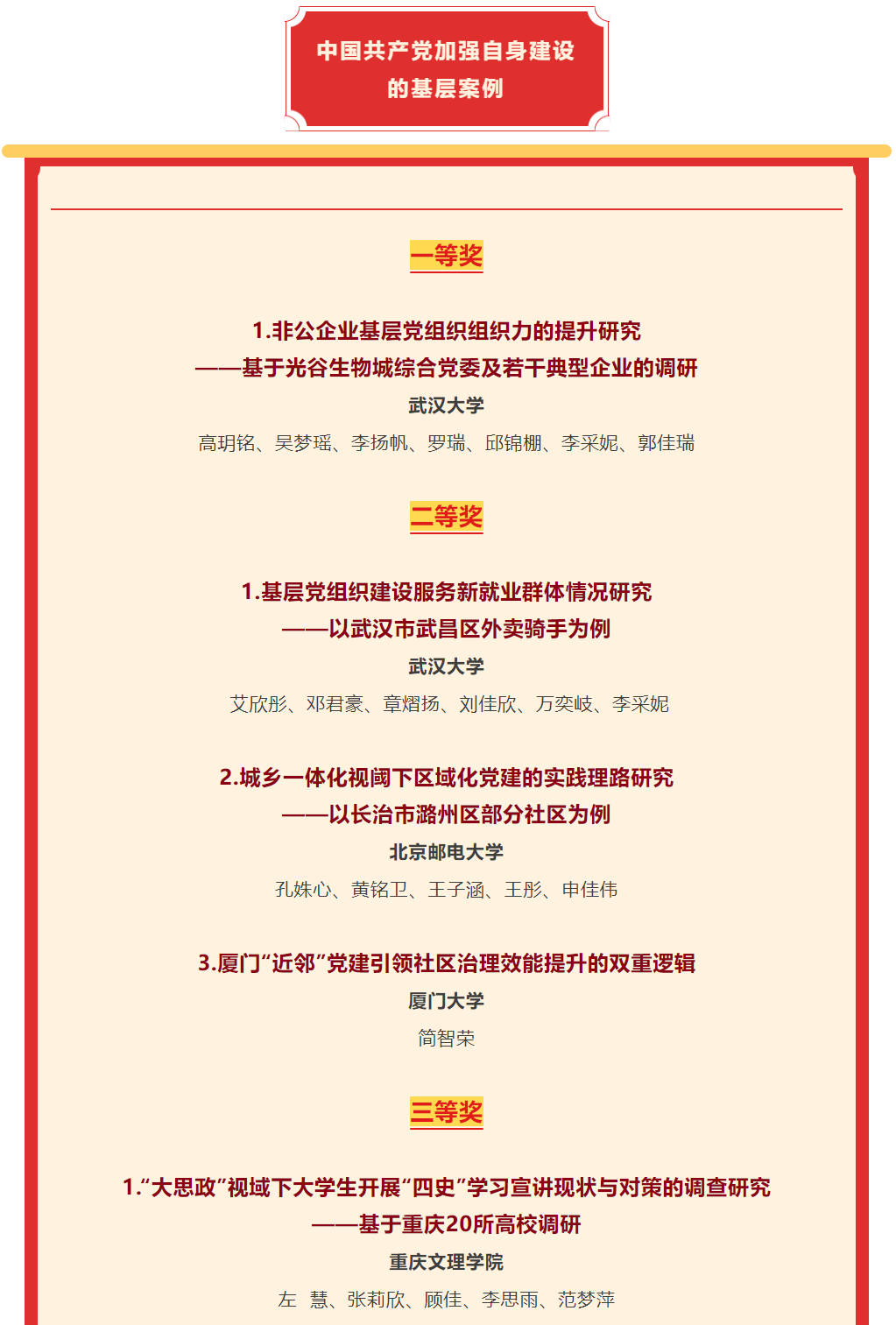 本届大赛由武汉大学K1体育联合10所全国重点K1体育主办,面向全国各高校在校老员工征集作品,共收到来自北京大学、中国人民大学、复旦大学、南京大学、南开大学、浙江大学、兰州大学、吉林大学等104余所高校作品。本次比赛分为四个主题,参赛选手共计1000余人,获奖作品仅53件,含10个一等奖、17个二等奖、26个三等奖。公司作品在“中国共产党加强自身建设的基层案例”主题中排名第五。