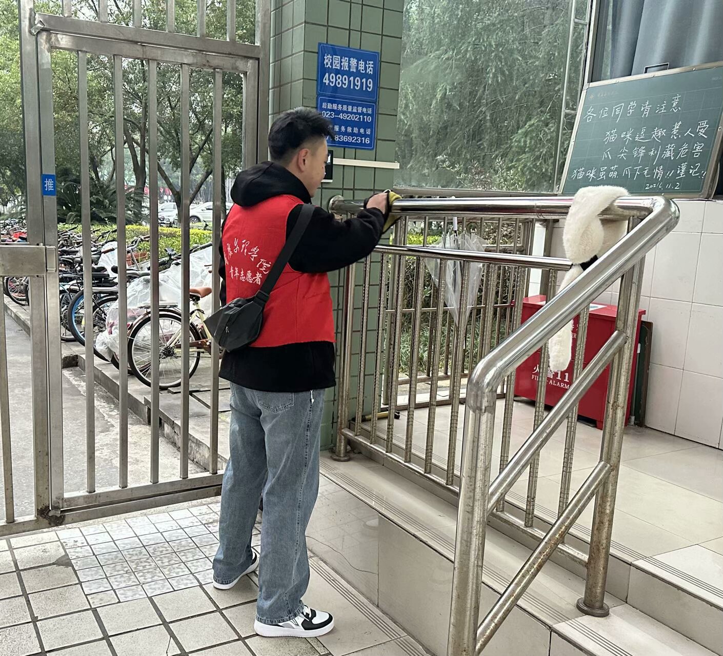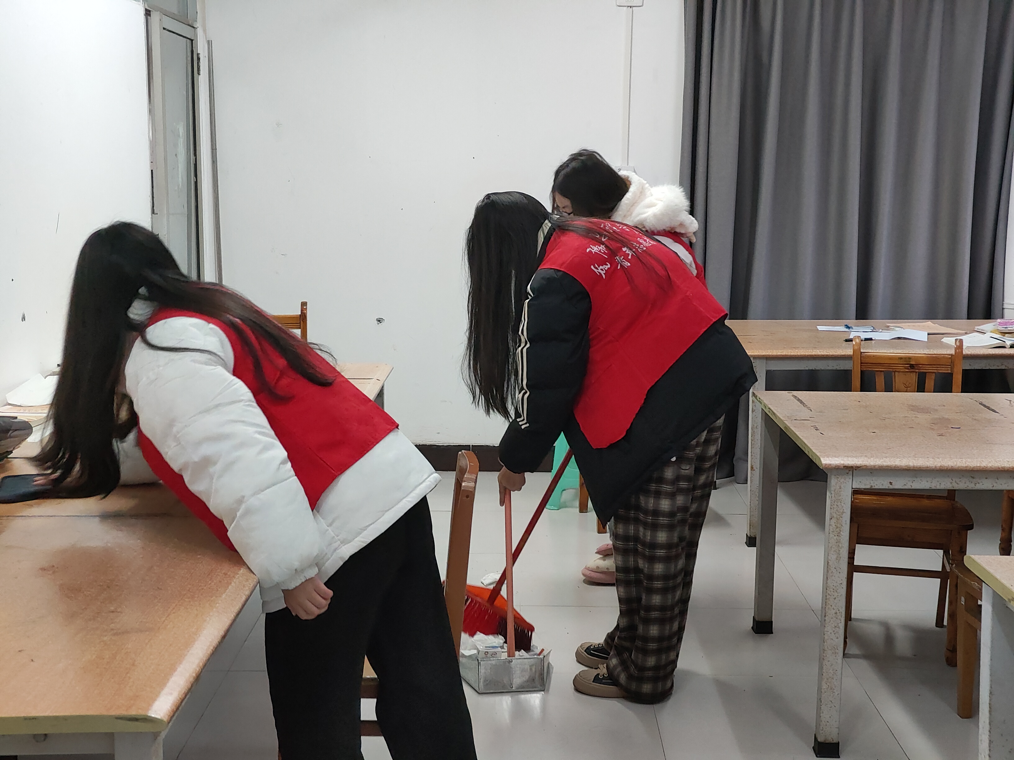 活动开始,各部门按照打扫场地进行分组,对听松苑各楼层、楼梯口、自习室以及菁华广场进行打扫。