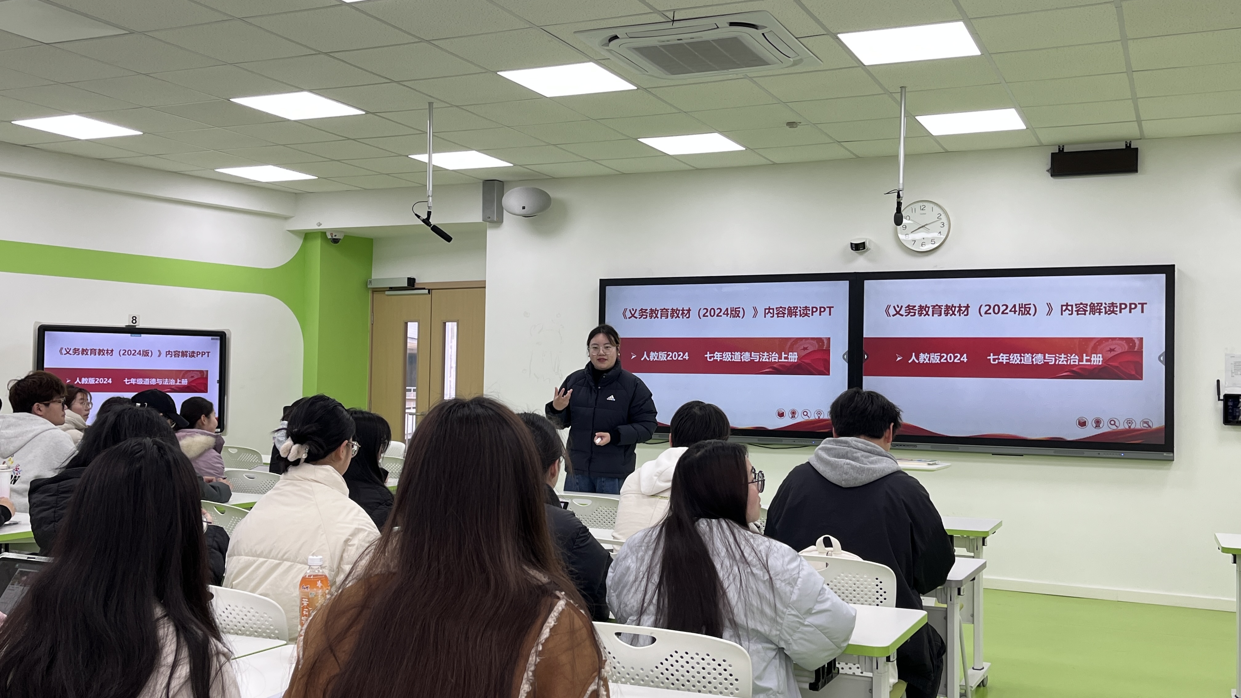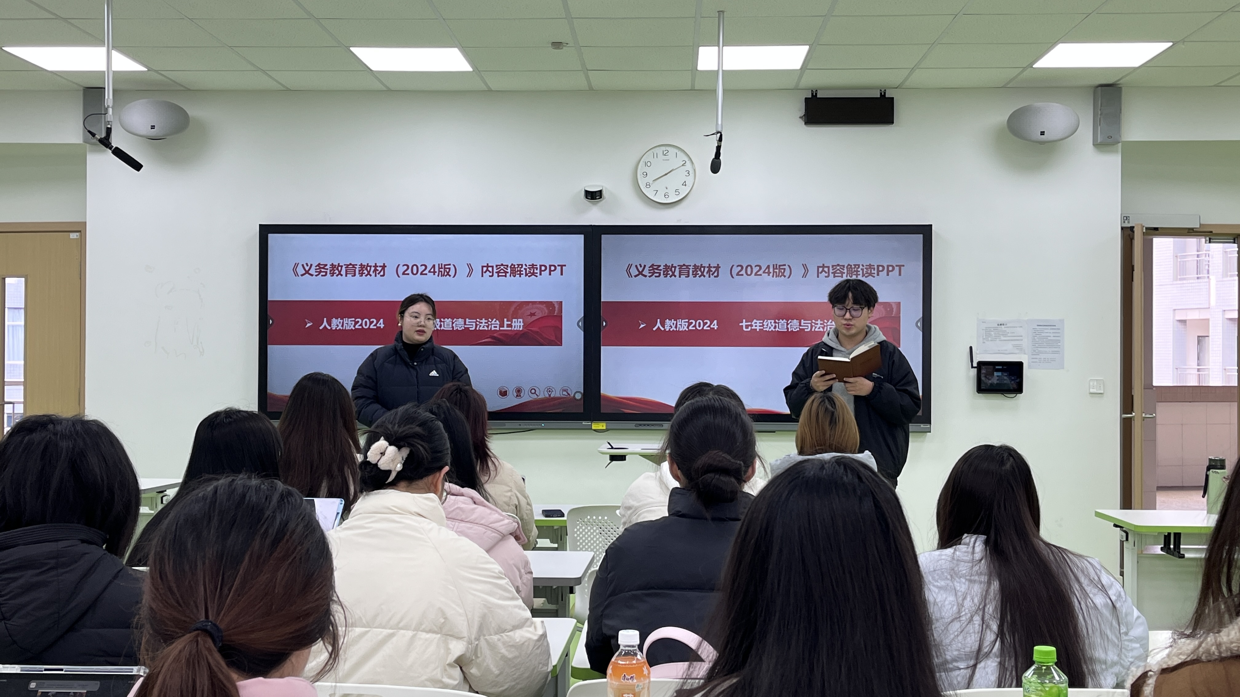 蔡爽老师以“新课标背景下道德与法治课程的教学探索”为主题,结合七年级《道德与法治》教材的整体变化,深度剖析了教材修订的逻辑与教学实施要点。她强调,教师需立足学科核心素养,灵活运用情境创设、案例讨论等方式,将抽象的理论转化为贴近员工生活的实践课题。同时,蔡爽老师结合自身赛课经验,从教师备课、员工参与双重视角提出建议:“一堂好课需要以学为中心。员工需要不断地尝试与反思,教师既要注重教学设计的逻辑性,更要关注课堂的灵动性,让师生在思维碰撞中共创知识。”通过蔡老师的深入讲解和典型示范,现场员工切身感受到初中道德与法治课趣味性与思辨性融合的教学设计魅力。